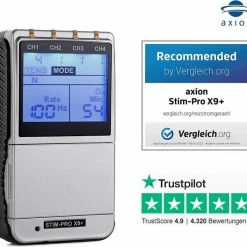 Met het STIM-PRO X9+ TENS-/EMS-apparaat van de Duitse fabrikant axion kan je direct aan de slag met pijntherapie, spieropbouw en massages. Dit alles in één apparaat wordt ook geleverd met accessoires. Je bent perfect uitgerust voor elke vorm van therapie zonder bijwerkingen of medicijnen met 37 programma’s en 8 individueel instelbare standen.