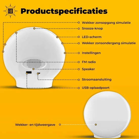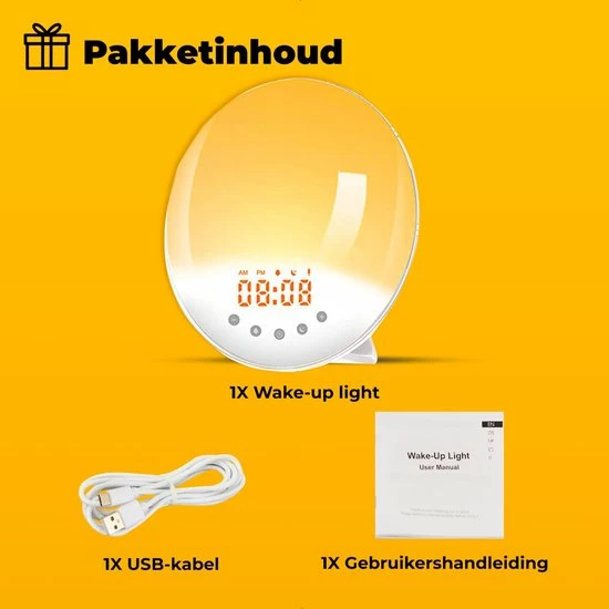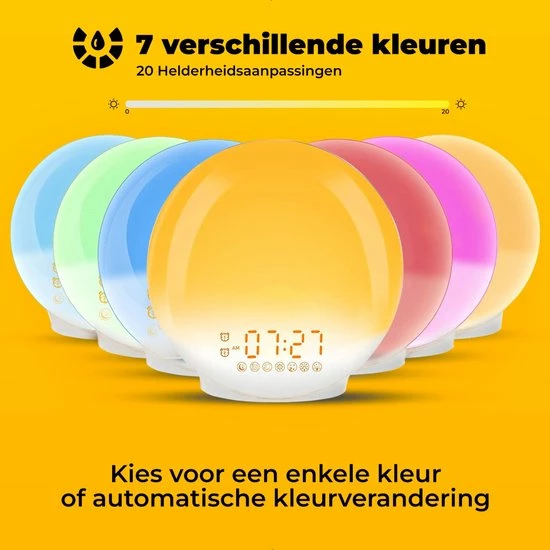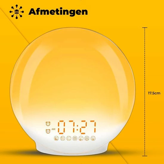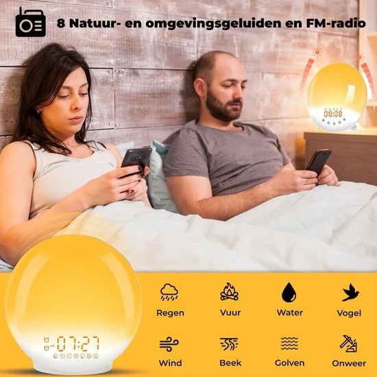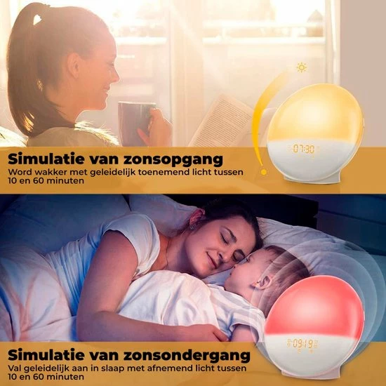 De wekker simuleert ‘s avonds een zonsondergang en vult de kamer ‘s ochtends weer met een zonsopkomst. Door de lichtintensiteit langzaam toe te laten nemen en te laten veranderen van kleur, wordt u op een geleidelijke manier wakker gemaakt. Hier heeft u de rest van de dag profijt van!