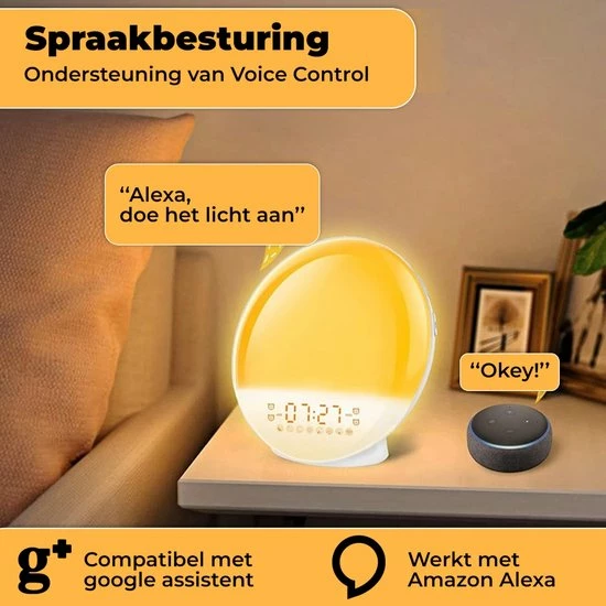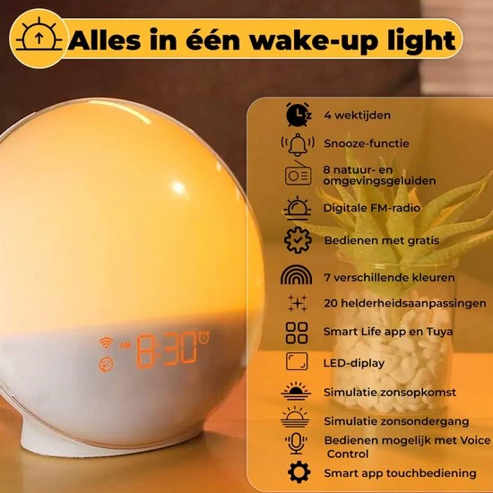 De lichtwekker bevat maarliefst 8 wekgeluiden, 3 slaapgeluiden, FM-radio, 2 wektijden, een timer, snooze-functie, 7 verschillende kleuren en 20 verschillende helderheidsinstellingen. Bedien de lamp eenvoudig met de app Smart Life of middels voice control.