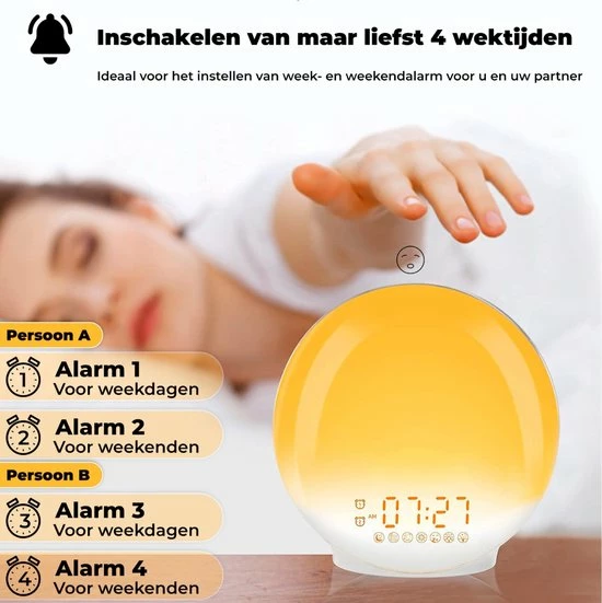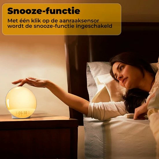 - 2 wektijden en snooze-functie De wekker bevat een snooze-functie die gemakkelijk te bedienen is met de touchfunctie boven op de lamp. De lichtwekker bevat 2 instelbare wektijden. Deze functie is ideaal voor het instellen van 2 wekkers, bijvoorbeeld die van u en uw partner.