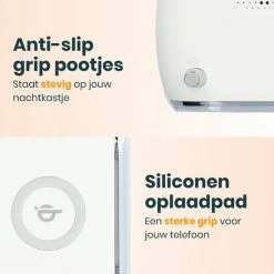 volledig opgeladen. Aan de bovenkant van de wekker zit een wireless charging functie. Door de