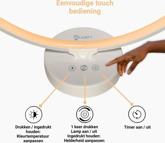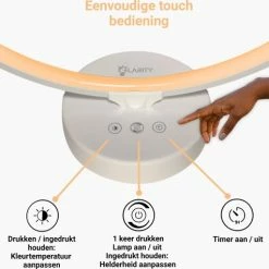 De Glarity lichttherapielamp is voorzien van een subtiel touchpanel in het voetstuk van de lamp. Aan de zijkant van het voetstuk zit ook een USB-poort, waarmee je bijvoorbeeld je mobiel, E-reader of headset kan opladen.