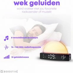 Stap jij ook altijd met het verkeerde been uit bed? Mis jij het uigerust wakker worden? Of kan jij niet in slaap komen? Met de alles-in-??n wekker van Boostiv is elke dag een feest! Met de uitstekende speaker, talloze licht kleurencombinaties, het moderne design en de wake-up light functie is elke dag eentje om van te genieten.