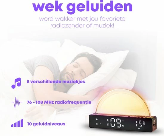 Nu kan je zelf het wekgeluid instellen! Er zijn 8 verschillende wekgeluiden en muziekjes. Naast deze vrolijke muziekjes kan je er ook voor kiezen om in slaap te vallen of wakker te worden met jouw favoriete radioprogramma.