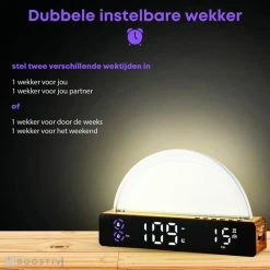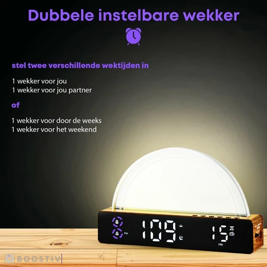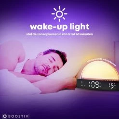 De wekker van Boostiv heeft een wake-up light functie. Wanneer je de wekker aan zet, zul je op een rustige wijze gewekt worden. De zonsopkomst start op het zwakste lichtniveau. Vervolgens zal geleidelijk de lichtsterkte toenemen, zodat je onbewust en comfortabel word gewekt! Dit is in te stellen van 5 tot 60 minuten voor het alarm.