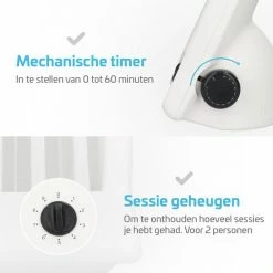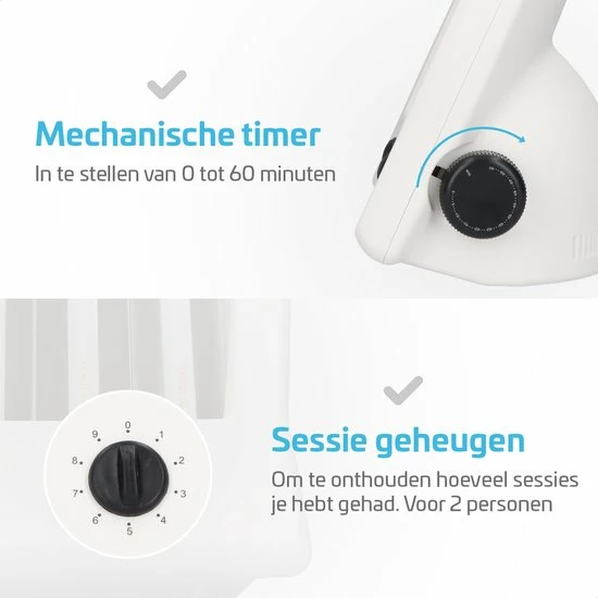 De Cmfrt Gezichtsbruiner komt met twee extra functies. Zo is er sessie geheugen voor twee personen, zodat u het aantal bruiningssessies moeiteloos bij kunt houden. Ook is de bruiner voorzien van een mechanische timer, waardoor je de tijd nooit uit het oog verliest.
