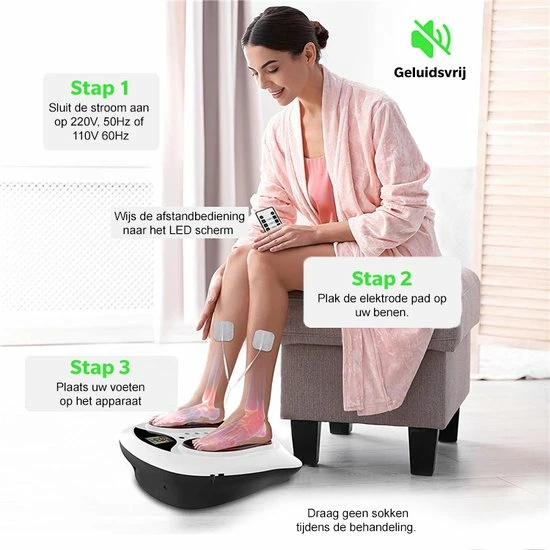 Het werkt heel simpel! Je plaatst je voeten op het apparaat en vervolgens stuurt deze elektrische impulsen door je lichaam. Deze elektrische impulsen zorgen voor een pompende werking in je spieren en zorgen hiermee voor een betere doorbloeding. Overtollig vocht en afvalstoffen zijn ook verleden tijd en worden dankzij deze manier ‘weggepompt’.