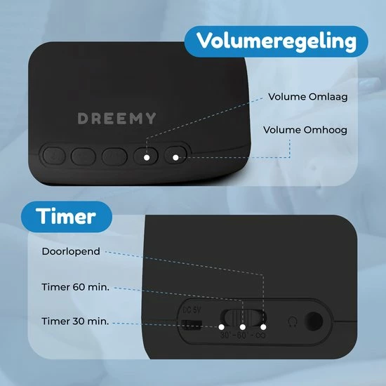 - Timer – De ingebouwde timer maakt het jou makkelijk. Kies ervoor om het licht en geluid de hele nacht af te spelen, 30 of 60 minuten.