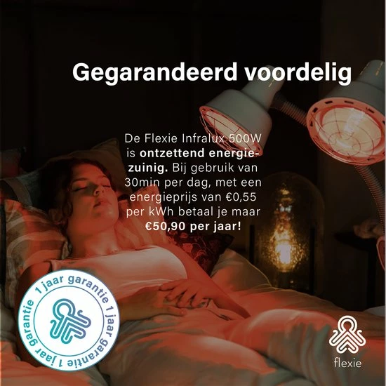 Laag energieverbruik: De Flexie Infralux 500W is ontzettend energiezuinig. Bij gebruik van 30min per dag, met een energieprijs van ?0,55 per kWh betaal je maar ?50,19op jaarbasis.
