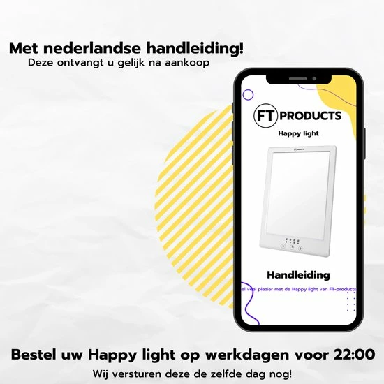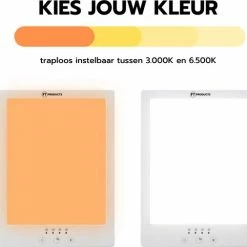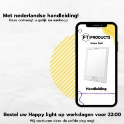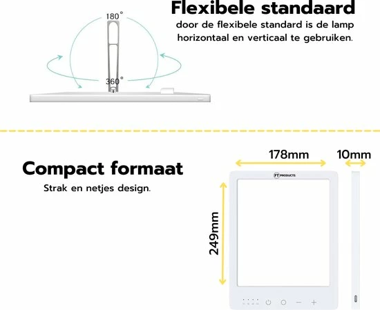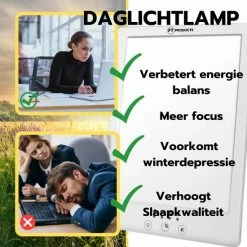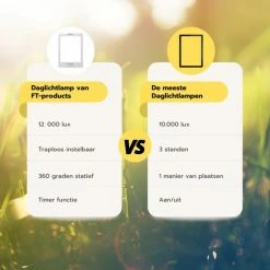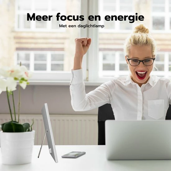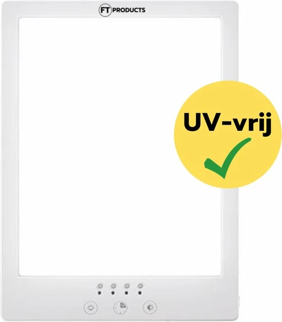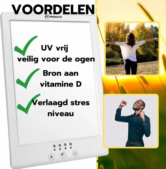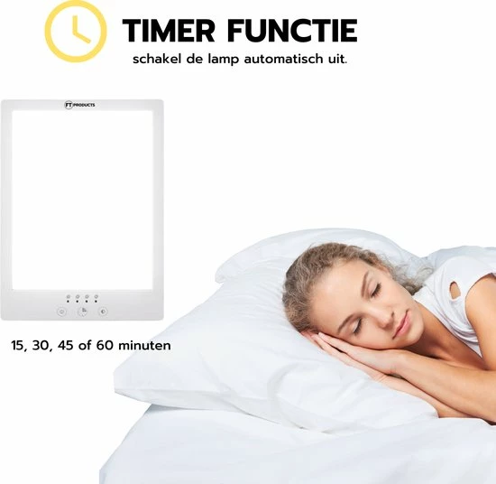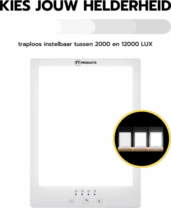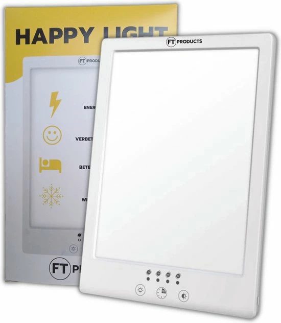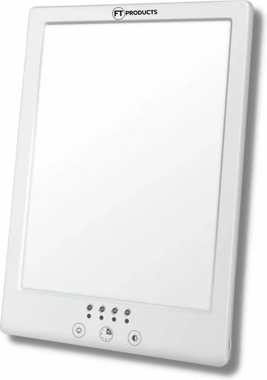 De FT-products daglichtlamp is de krachtigste daglichtlamp voor thuis ?n professioneel gebruik. Heb je elk najaar weer klachten van een winterdip, zoals vermoeidheid en een sombere stemming? Dan is deze stijlvolle lamp een echte aanrader. De grote en energiezuinige lichttherapielamp straalt 12.000 lux uit op een afstand van 105 cm. De maximale gebruiksafstand is zelfs 1,7 meter! Daardoor kunnen meerdere mensen tegelijkertijd profiteren van de lichttherapie. Zo kan jij je vitamine D niveau eenvoudig op pijl houden zodat je focus, humeur en slaap verbetert. De lamp heeft een compact en draagbaar design en is daardoor overal eenvoudig te gebruiken. De Daglichtlamp is traploos instelbaar en een ingebouwde timer waarmee je de lamp geheel naar je eigen wensen afstelt. Gebruik de lamp 30 minuten per dag en je zult snel merken dat licht therapie afhandelt met je energie dip!