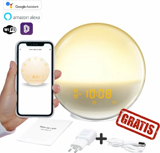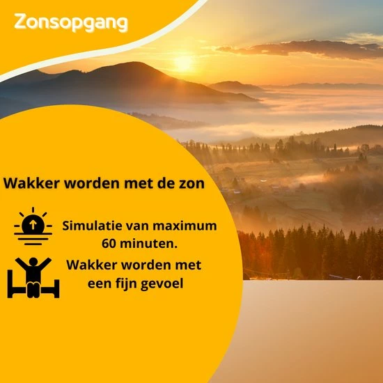 Licht heeft een grote invloed op belangrijke processen in ons lichaam. Dit be?nvloedt onze prestaties en energieniveaus. Door wakker te worden met de GoodsWill Wakeup Light ondersteun je je biologische klok; Je wordt op een natuurlijke wijze wakker. De simulatie van een geleidelijke zonsopgang maakt u wakker gedurende 10 ? 60 minuten, waarbij de lichtintensiteit tot 100% toeneemt. Hiermee kan je de dag al vol energie beginnen!