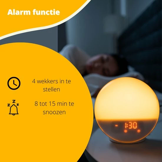 De WakeUp Light heeft 8 instelbare wektijden. Ideaal als je doordeweeks en in het weekend een wekker wilt zetten, bijvoorbeeld wanneer jij en je partner op verschillende tijden wakker wordt, of als je een dubbele wekker wilt zetten.