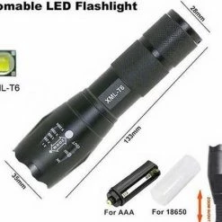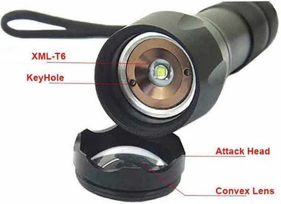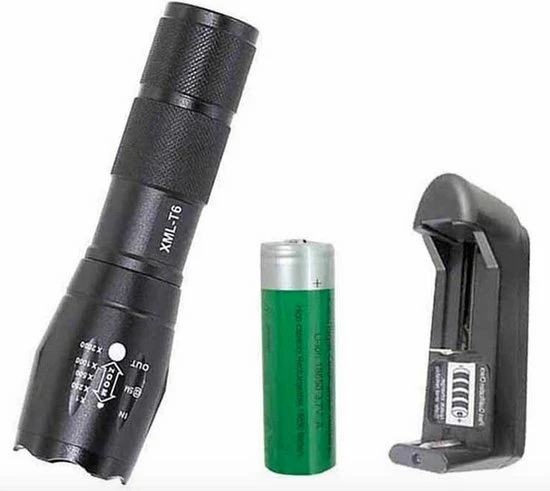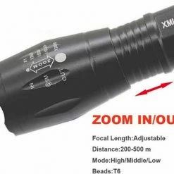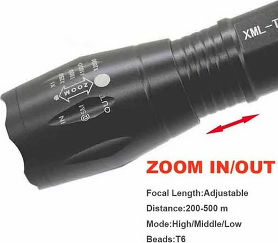 Zeer felle zaklamp met CREE-led T6 3800LM. Werkt op accu. Wordt geleverd met meegeleverde lader op 5V USB alsook een adapter voor 3 AAA batterijen (zelf te kiezen wat u gebruikt). Ideaal als beveiliging om inbrekers te verblinden. Schijnt 200 tot 500 meter ver (afhankelijk van de gekozen zoom-stand).