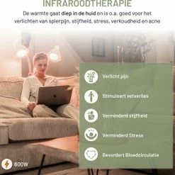 De warmte van de lamp dringt diep door in het weefsel. Dit bevordert de bloedcirculatie en verlicht direct de pijn. Hierdoor neemt uw mobiliteit toe en ervaart u een betere kwaliteit van beweging. Daarnaast zorgt infraroodstraling voor een totale ontspanning van de spieren, waardoor ook de geest zich ontspant. Slapeloosheid en vermoeidheid worden op deze manier op een natuurlijke wijze tegengegaan.