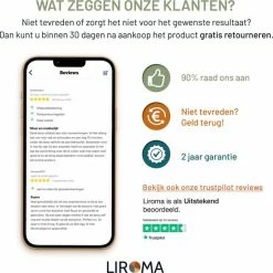 Iedereen moet zonder enige risico?s de voordelen van de Liroma? apparaten kunnen ervaren. Bent u niet tevreden en zorgt het product niet voor de gewenste resultaten? Dan kunt u binnen 30 dagen na aankoop het product gratis retourneren. Daarnaast bieden wij ??n jaar garantie en bieden wij 24/7 service voor persoonlijk advies.