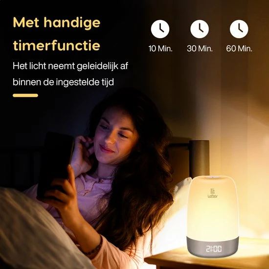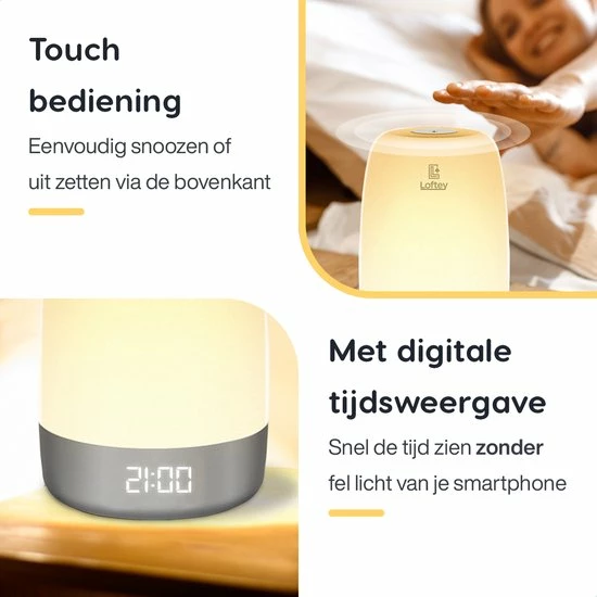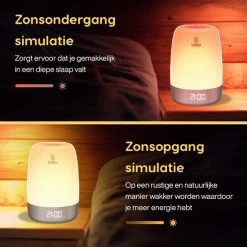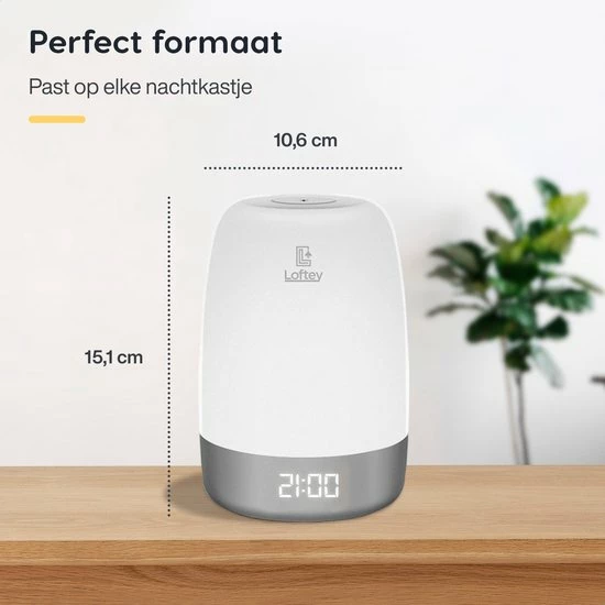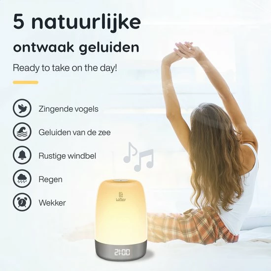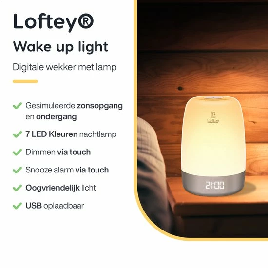 Dankzij de wake-up light van Loftey behoort een ochtendhumeur tot het verleden! Ben je ook klaar met wekkers die je abrupt uit je slaap halen? De lichtwekker biedt de oplossing, deze wekt je op een rustige manier door middel van licht en natuurlijke geluiden. De wake-up light is eenvoudig in gebruik, uitgerust met 7 verschillende wekgeluiden & lichtkleuren en staat bovendien mooi op je nachtkastje dankzij het fraaie design.