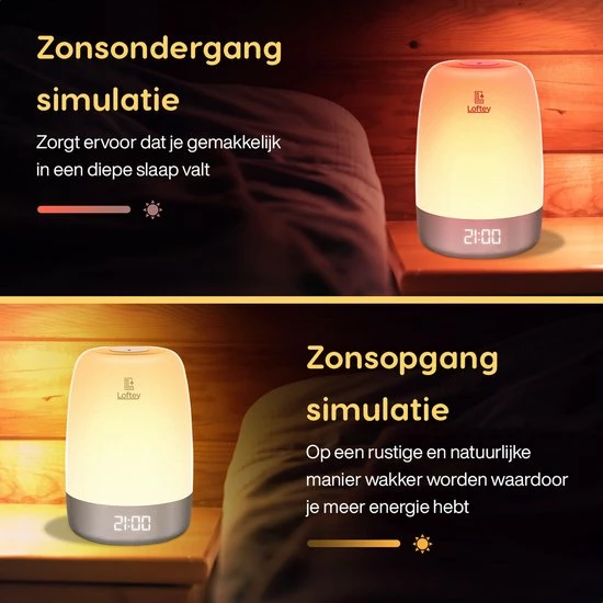 Een goede nachtrust is zeer belangrijk, maar misschien ervaar jij net als vele andere mensen problemen met inslapen. Ook daar kan de lichtwekker van Loftey je bij helpen. Door middel van geleidelijk afnemend licht wordt een zonsondergang gesimuleerd, dankzij het warme licht van de lichtwekker zal je snel in een diepe slaap vallen. Schaapjes tellen is niet meer nodig!