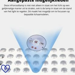 ~ Bevordering van bloedcirculatie – Doordat de warmte van de lamp diep doordringt in uw weefsel bevordert dit de bloedcirculatie in uw lichaam. Een betere bloedcirculatie is belangrijk voor uw mobiliteit en een betere kwaliteit van beweging.