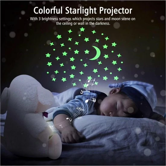 Een innovatie in grootte voor het slapen van baby’s. Het magische schaap verspreidt licht en rustgevende geluiden.Met de intelligente wijnsensor reageert de schaap de om de baby te kalmeren, kies het gewenste licht en geluid en uw baby zal heerlijk in slaap vallen.
