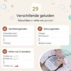✓ Keuze uit 29 natuurlijke geluiden, inclusief white noise & baarmoeder geluid
