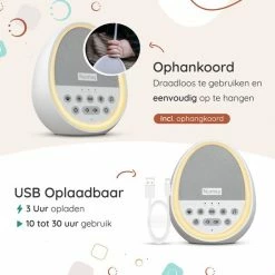 Eenmaal white noise, is overal white noise. Als je baby eenmaal heerlijk weg kan dromen met Numsy’s Calm, dan wil je kleintje dat overal doen. Om die reden is het design heel compact en bevat het een sterke oplaadbare batterij. Om het je nog makkelijker te maken wordt het apparaat geleverd met een handig ophangkoord. Zo kun je jouw white noise overal mee naar toe nemen en zelfs tijdens de wandeling aanzetten en aan de wagen hangen. Handig hè?
