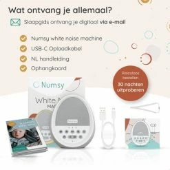 Behalve een prachtig designed white noise apparaat, krijg je nog een USB-kabel, duidelijke handleiding in het Nederlands en een e-book met tips en informatie over witte ruis.