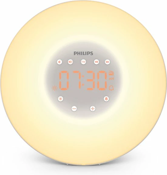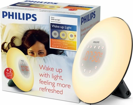 Word makkelijker, frisser en energieker wakker met natuurlijk licht met de Philips wake-up light HF3506. Ge?nspireerd door de zonsopgang maakt de Philips wake-up light gebruik van een combinatie van licht en geluid, waardoor je op een natuurlijke manier gewekt wordt. Het licht van de zonsopgangsimulatie verandert van aangenaam geel naar helder geel. Dit in combinatie met prettige natuurgeluiden zorgt voor een goed begin van je dag.