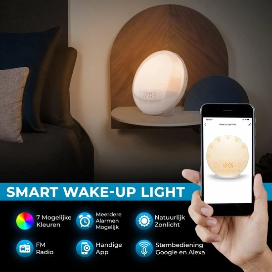 Door de slimme technologie van de Smart Life Wake-up light wordt je elke dag uitgerust en ontspannen wakker, dat komt door zonsopgang stimulatie. De lichtsterkte neemt zo’n 10 tot 60 minuten langzamerhand toe! Dit kun je via een app allemaal instellen zoals: vanaf welke lichtsterkte tot aan de muziek die afgespeeld moet worden. Alles is in te stellen naar jou verkeur! Daardoor krijgt jouw lichaam op natuurlijke wijze een seintje zodat die weet dat het tijd is om op te staan.