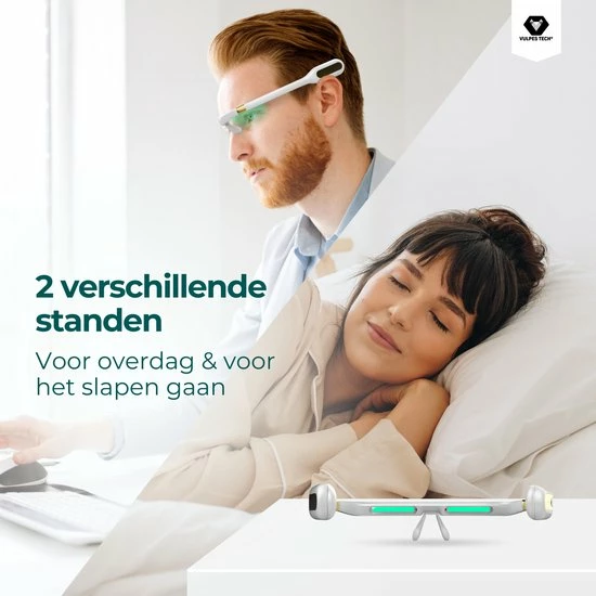 Wij hebben een lichtterapiebril met 2 standen weten te ontwikkelen welke voor in de avond een kalmerende werking heeft en voor in de ochtend een energie verhogende werking heeft.