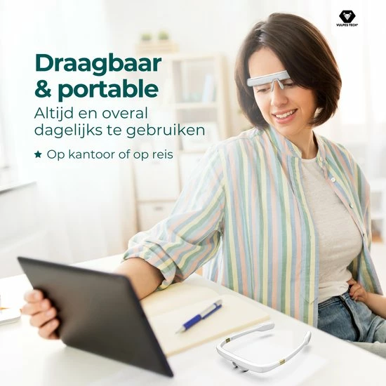 De bril kun je ook gemakkelijk overal gebruiken. Doordat hij compact en draagbaar is, kun je hem overal mee naartoe nemen en gebruiken op ieder moment, bijvoorbeeld op kantoor of op reis!